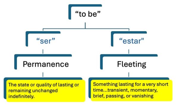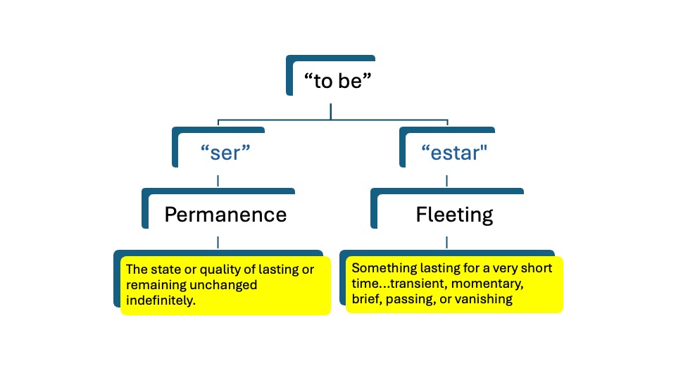 In Spanish there are two verbs translated into English as “to be”. The first, “ser”, has a sense of permanence so you might say something like “I am (ser) a daughter of God” meaning I am and will continue be a daughter of God. The second, “estar”, is fleeting. You might say, “I am (estar) here”, but I won’t always be here.